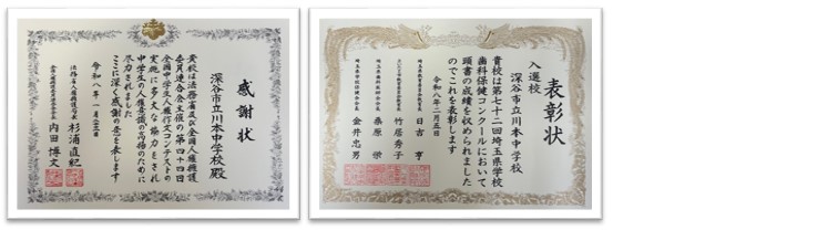 川本中学校が2つの表彰を受けましたので紹介します。1つは、法務省及び全国人権擁護委員会連合会から人権作文への感謝状です。もう1つは、埼玉県学校保健歯科コンクール入選です。川本中学校の教育活動が評価された結果だと嬉しく思います。
