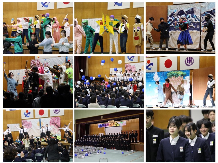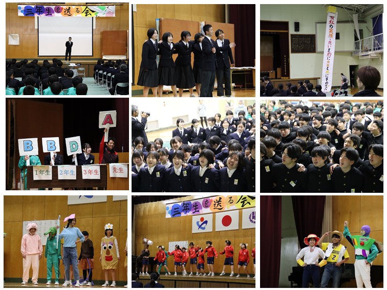 卒業を間近に控えた3年生に、これまでの感謝を込めて3送会を開催しました。生徒会本部役員が中心となり、1年生や2年生が劇や歌、ダンスで盛り上げました。思い出スライドショーやビデオレターなど、とても感動的な会となりました。