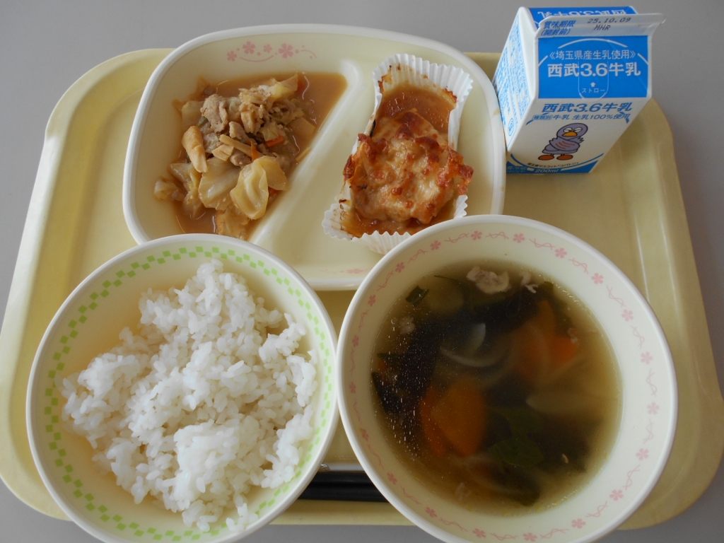 ⭐︎牛乳 ⭐︎ご飯 ⭐︎照り焼きハンバーグ ⭐︎根菜サラダ ⭐︎お月見汁 ⭐︎十五夜ゼリー 川本北小では、一足早い「お月見給食」です。お月見汁の中には、月に見立てた白玉団子が入っています。 月曜日は、6年生親善応援給食になります