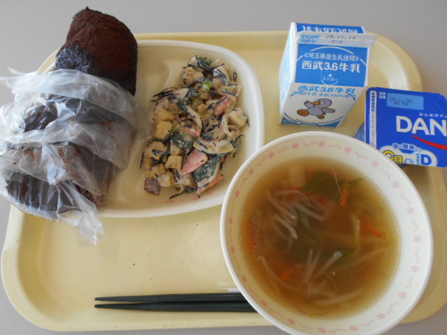 ⭐︎牛乳 ⭐︎ココア揚げパン ⭐︎ほうれん草とひじきのサラダ ⭐︎ABCスープ ⭐︎フルーツポンチ