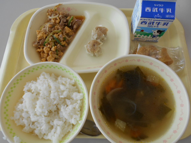 ★わかめご飯 ★鶏肉のカレーマヨネーズ焼き ★キャベツのペペロンチーノ風 ★スタミナスープ ★牛乳