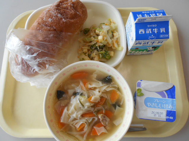 ★きなこ揚げパン ★はるキャベツとじゃこのサラダ ★ワンタンスープ ★牛乳