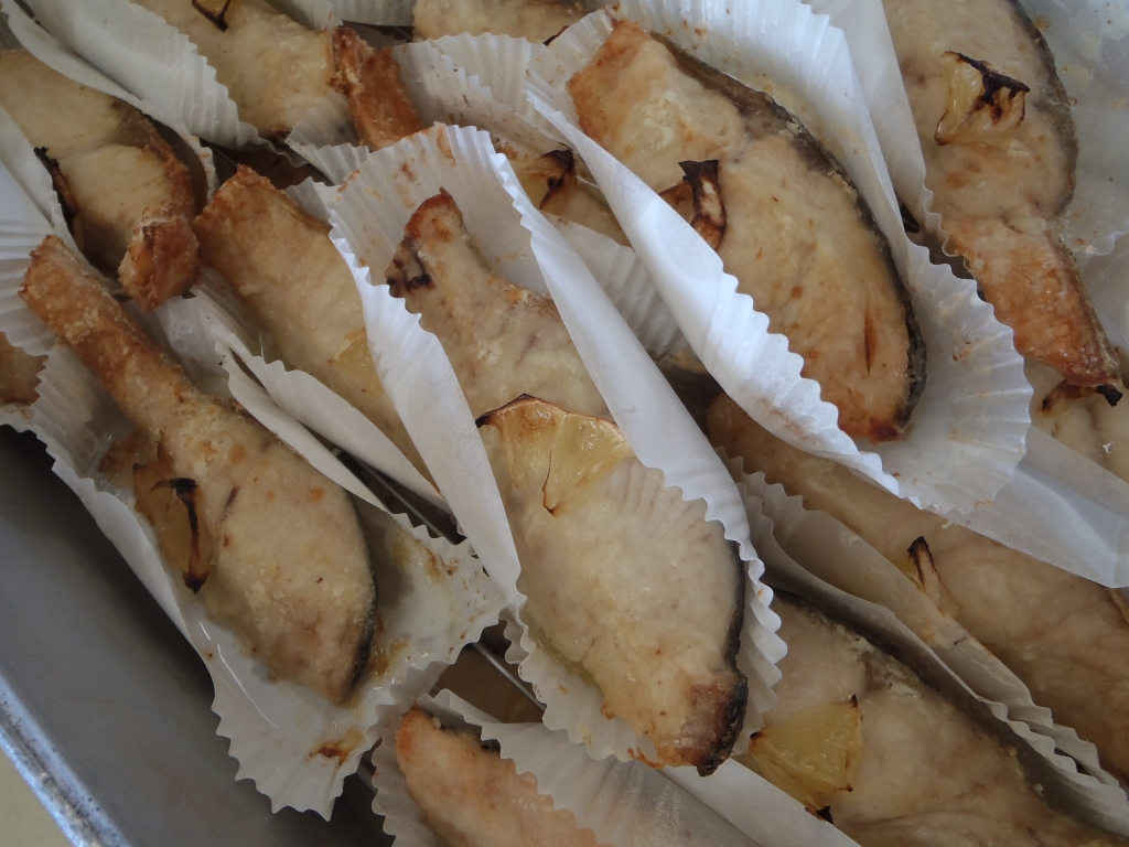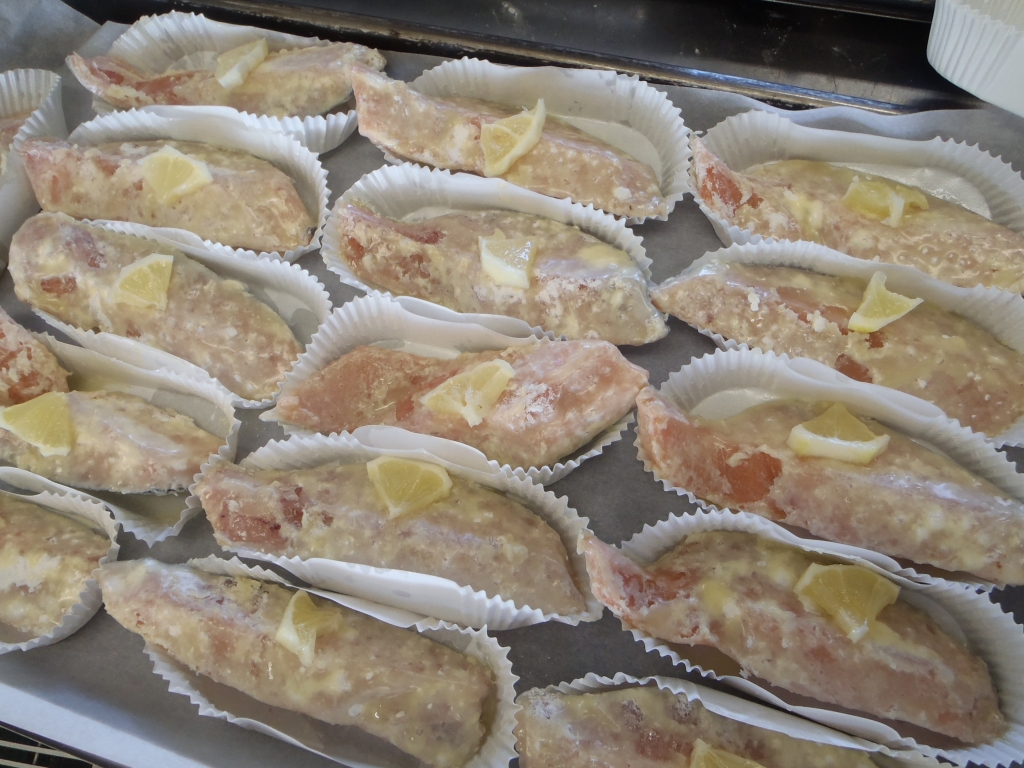 ムニエルは、鮭に小麦粉をまぶして溶かしバターを絡めて、レモンをのせて焼いています。