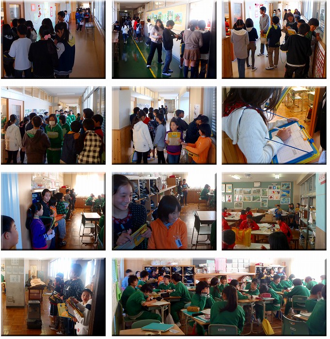 川本北小・南小の6年生の児童たちは、授業をやっている教室の廊下から見ているグループや、照れくさそうに教室に入って見学しているグループもありました。児童たちは、授業を見学しながら見学ノートにメモをしていました。
