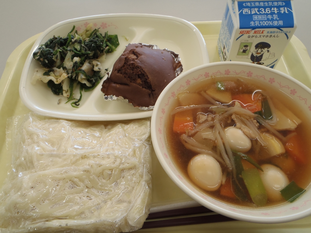 今日の給食は、もやしラーメン、手作り豆腐ドーナツ、チョレギ風サラダでした。 チョレギ風サラダは、ちりめんじゃこやのりが良いアクセントとなっていました。豆腐ドーナツも、中はサクサク、外はカリカリでとてもおいしかったです(^^)