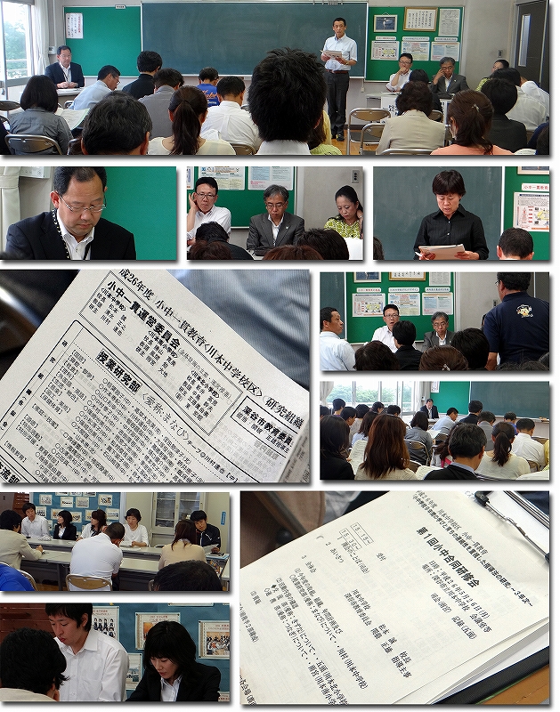 深谷市教育委員会から関根正雄指導主事を迎え、第1回小中一貫合同会議が川本中学校会議室にて開催されました。川本中学校校区では、今年で3年目をむかえ、今年度は9ヶ年を見通した年間指導計画作成に向けた取組が始まりました。