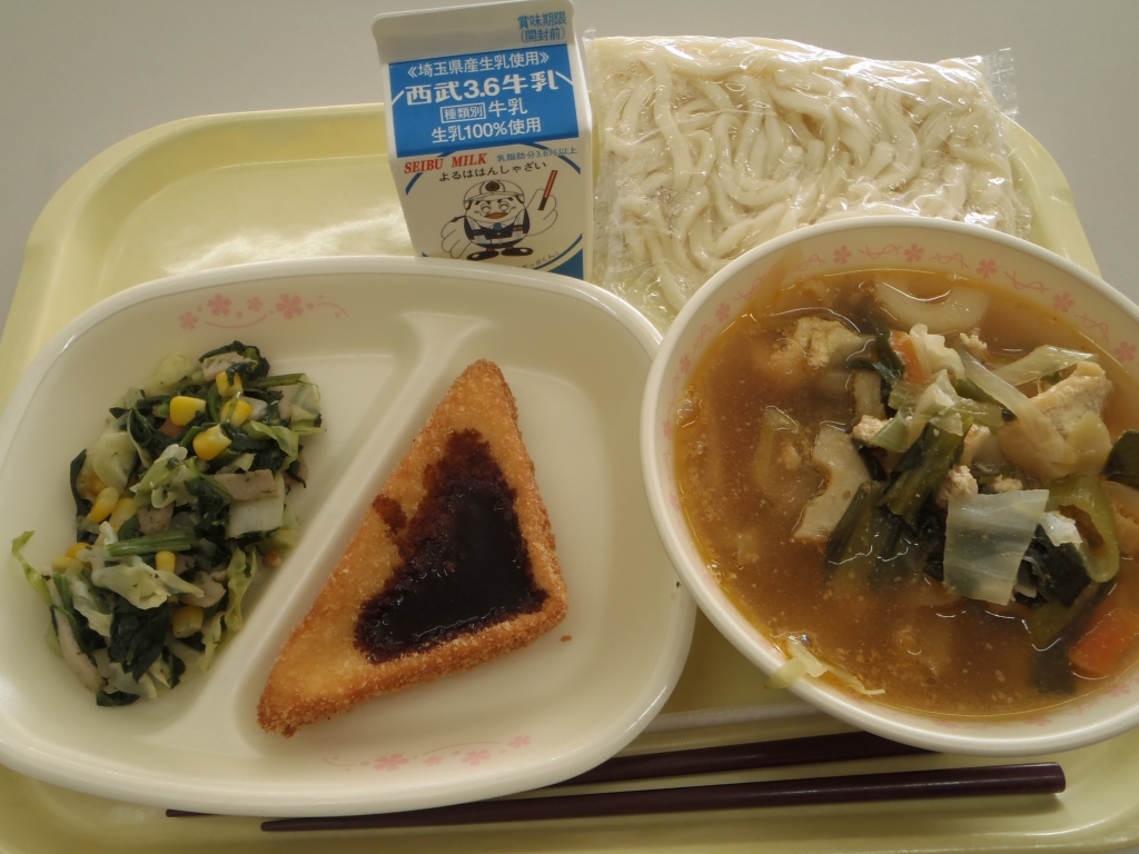⭐︎牛乳 ⭐︎ご飯 ⭐︎ホルモン揚げ ⭐︎上州サラダ ⭐︎こしね汁 今日は群馬県富岡市と深谷市の友好関係を記念した給食、「お富ちゃん給食」です。 富岡市には、世界遺産の富岡製糸場があります。渋沢栄一翁も富岡製糸場の設立に貢献しました。ホルモン揚げは...