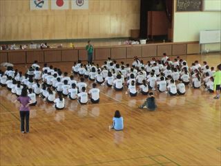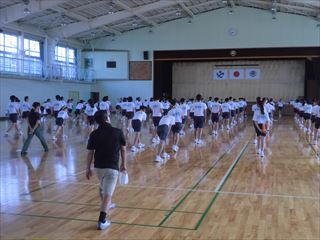 さて、まだグランドは使用できないので、3年生が体育館で学年練習を行いま