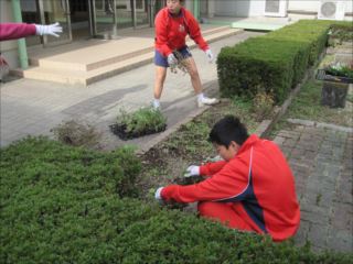 本日は、生徒玄関前の花壇の整備やロードレース大会に向けてコース
