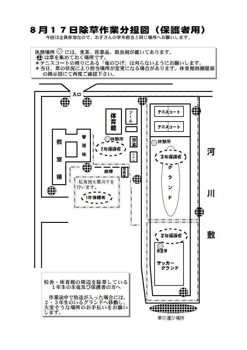 8月も半ばを過ぎ、夏休みも終わりに近づきつつありますが、毎年この時期に行っている親子除草作業を明日実施いたします。グラウンドにこの夏休み中に伸びた草をみなさんで協力して取り除き、気持ちよく体育祭を迎えたいと考えています。大変暑い日が続いていますが、御協力をよろしくお願いいたします。今回は保護者全員対象なので、お子さんの学年分担場所での除草です。
