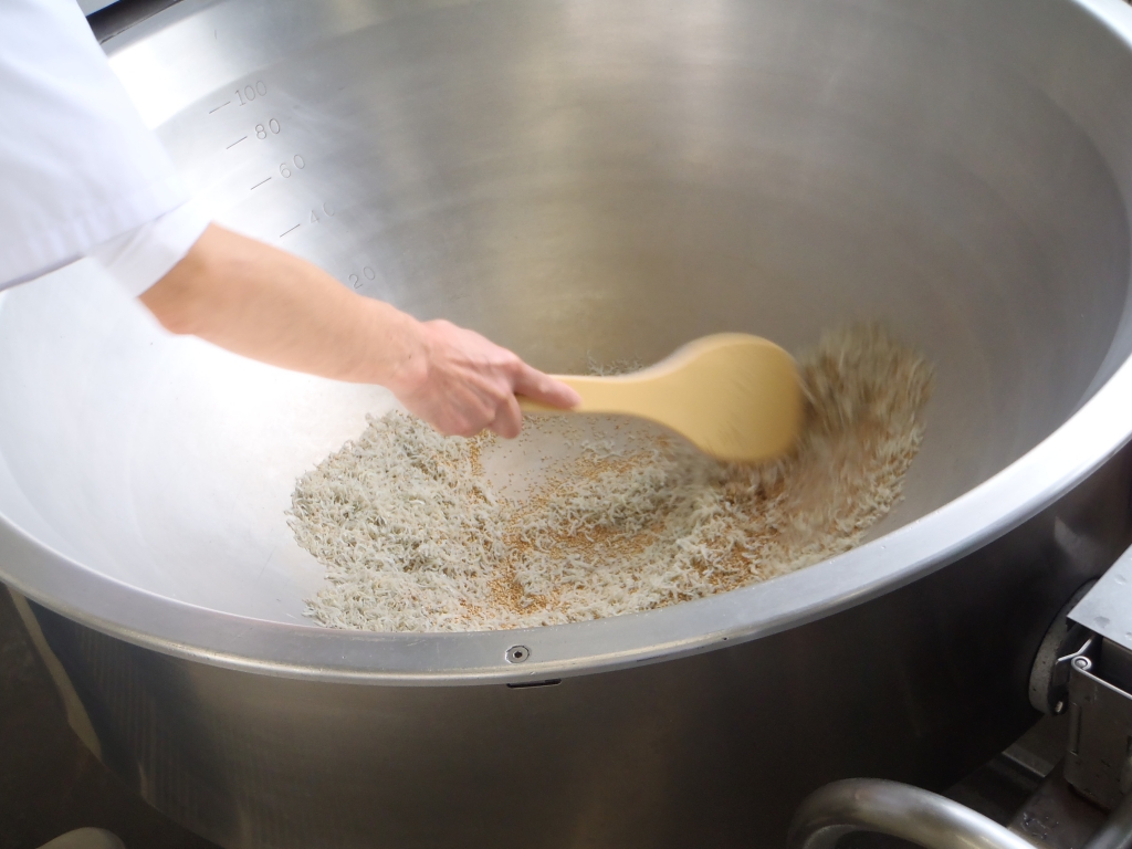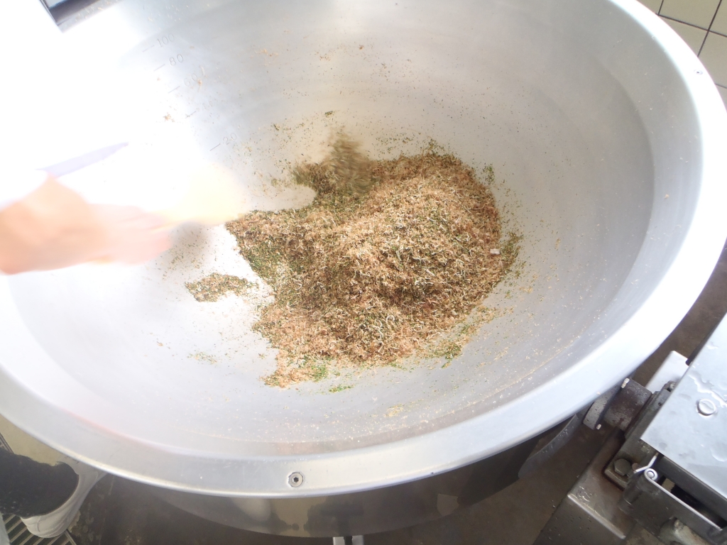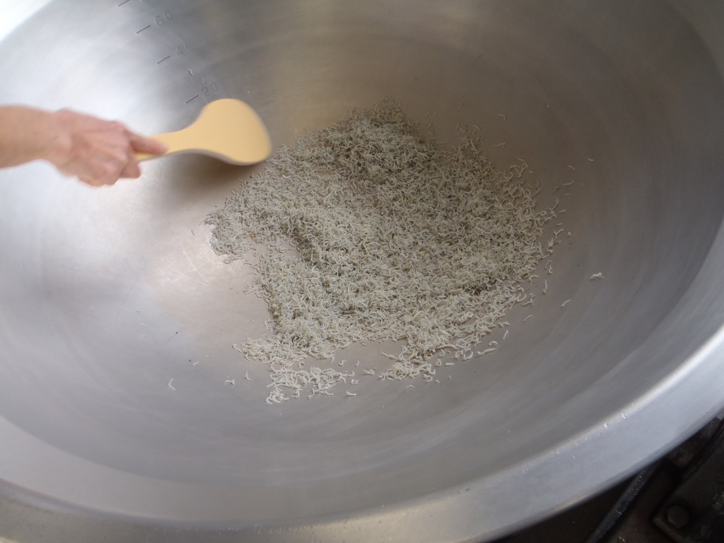 じゃこ・ごま・かつお節・あおのり・ゆかり・せん茶を焦がさないように煎っています。