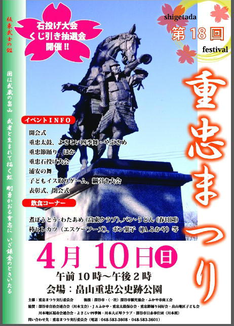 4月10日(日)午前10時から、畠山重忠公史跡公園で「第18回・重忠まつり」が開催されます。是非、ご参加ください。特に、石投げ大会では中学生(男・女)の部もあります。川中生のみなさんも出場してはどうでしょうか?優勝・準優勝・第3位までには、豪華賞品が出るそうです。