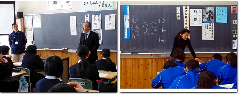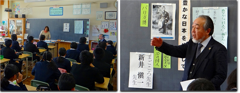 本日は2年生の道徳授業で「まごころ先生」の新井愼一先生が来てくれました。深谷市の偉人渋沢栄一翁についてお話してくれました。生徒たちは話を聞くことで、渋沢栄一翁の生き方や考え方を学ぶことができました。