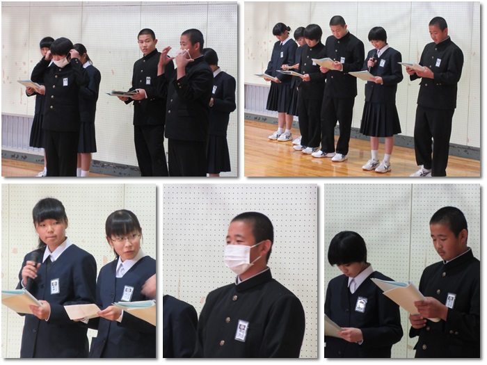 今日の終業式の最後に、保健関係について2年生保健委員から話しをしてもらいました。マスクの着用方法についても説明しました。また、冬休みのしおりにも詳しく書いてありますので、よく読んでおいてください。2年生のみなさんありがとうございました!