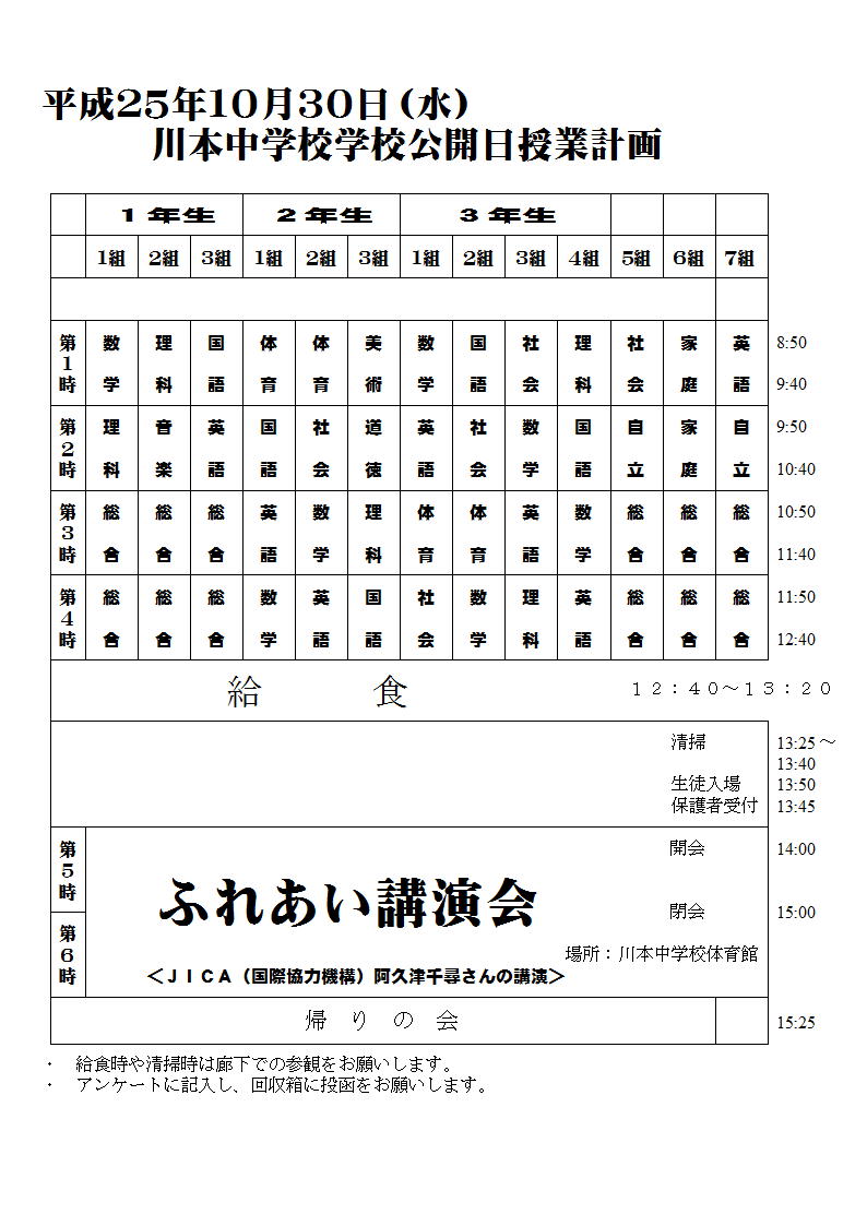 お忙しい中ですが、ぜひ、日頃の授業の様子をご覧ください。午後は、JICA(国際協力機構)の方をお招きしての「ふれあい講演会」を実施します。多くの保護者の皆様、地域の皆様のご参観をお待ちしております。