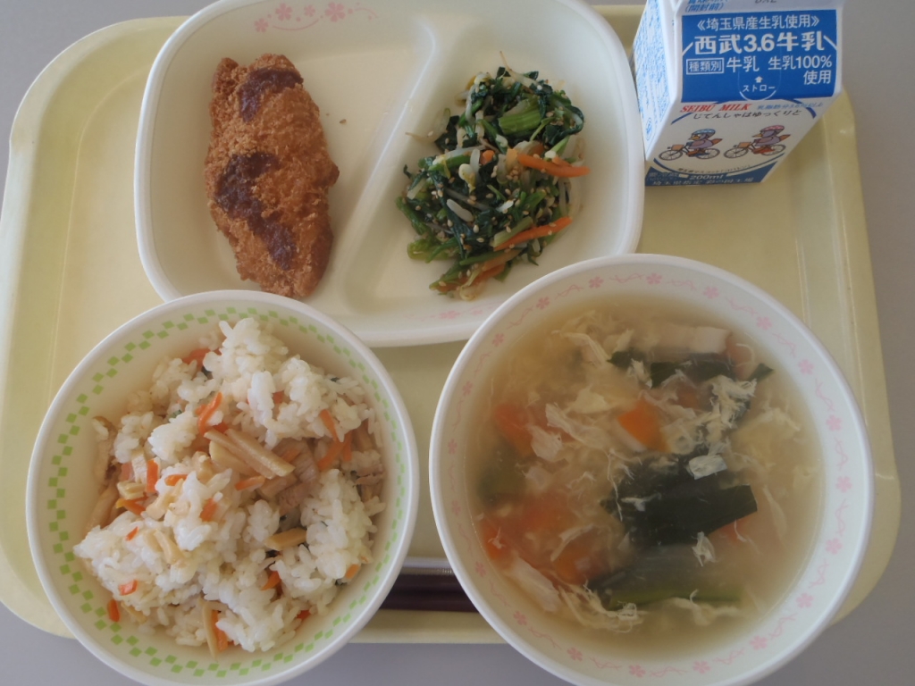 今日の給食は、ご飯、三食そぼろ、ししゃもフリッター、キム豚汁でした。 キム豚汁は、キムチのピリ辛の味がアクセントとなっており、具だくさんでとてもおいしかったです!!