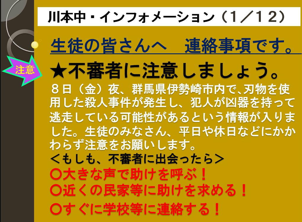 本日(12日)、市教委より、生徒の安全確保についての情報提供がありました。