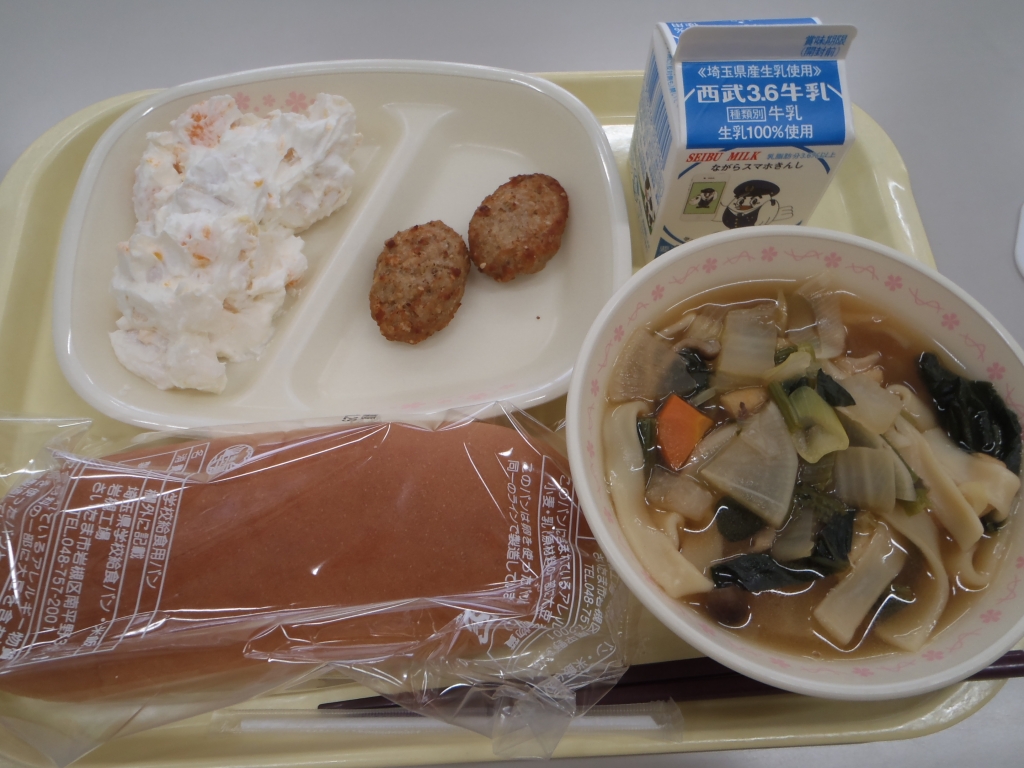 ⭐︎牛乳 ⭐︎ご飯 ⭐︎ホルモン揚げ ⭐︎上州サラダ ⭐︎こしね汁 今日は群馬県富岡市と深谷市の友好関係を記念した給食、「お富ちゃん給食」です。 富岡市には、世界遺産の富岡製糸場があります。渋沢栄一翁も富岡製糸場の設立に貢献しました。ホルモン揚げは...