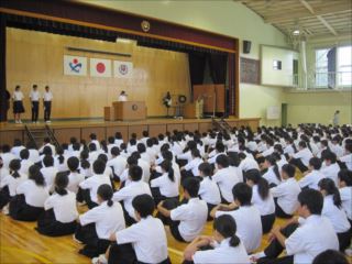 本日、体育館で1学期終業式を行いました。校歌斉唱の後、生徒会・各学年代表者の