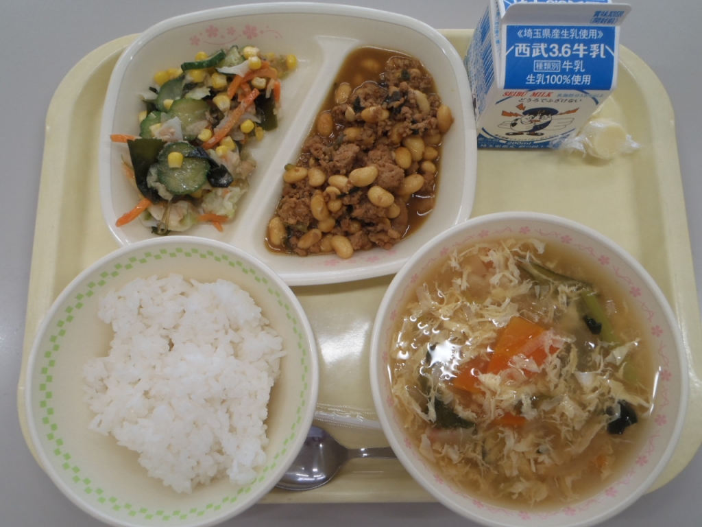 今日の給食は、ご飯、コーンシュウマイ、豚肉とブロッコリーのオイスターソース炒め、ワンタンスープでした。 今日はとても寒かったので、温かいワンタンスープが体にしみてとてもおいしかったです(^^)