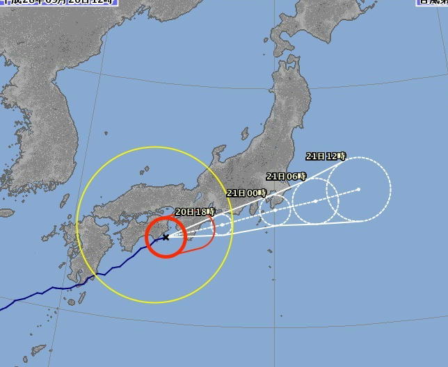 *台風16号の予想進路(2016.9.20.12:00現在)気象庁より