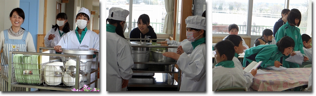 1年生にとっては「給食室はどこ?」「配膳室はどこ?」で、すべてがまったく分からない様子でした。でも、やっぱり給食の時間は楽しそうです。