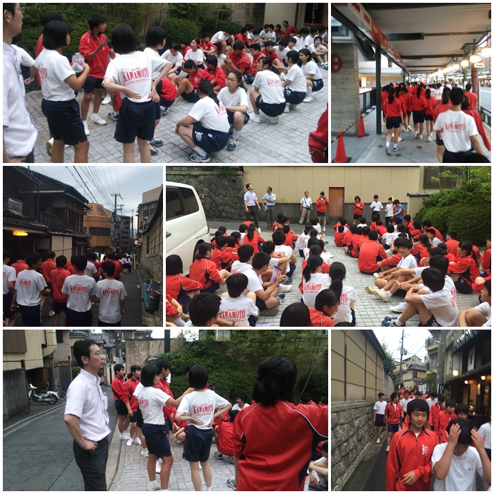 夕飯が終わり、予定通りに「夕方散歩」のようですね。少し肌寒いという情報が入っていますが、半袖短パンの生徒も・・・。
