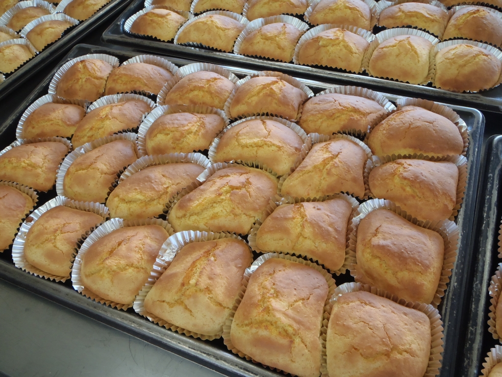 オレンジパンケーキは、オレンジシュースとすり下ろしたにんじんが入っています。焼き上がりは、きれいなオレンジ色に仕上がり、給食室に甘い香りが広がりました!ほどよい甘さで、にんじんが苦手な人も食べやすかったのではないでしょうか。