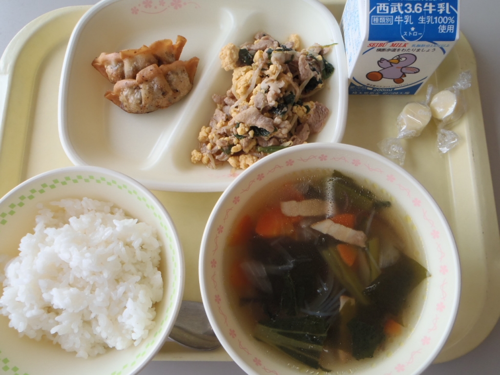 今日の給食は、ご飯、三食そぼろ、ししゃもフリッター、キム豚汁でした。 キム豚汁は、キムチのピリ辛の味がアクセントとなっており、具だくさんでとてもおいしかったです!!