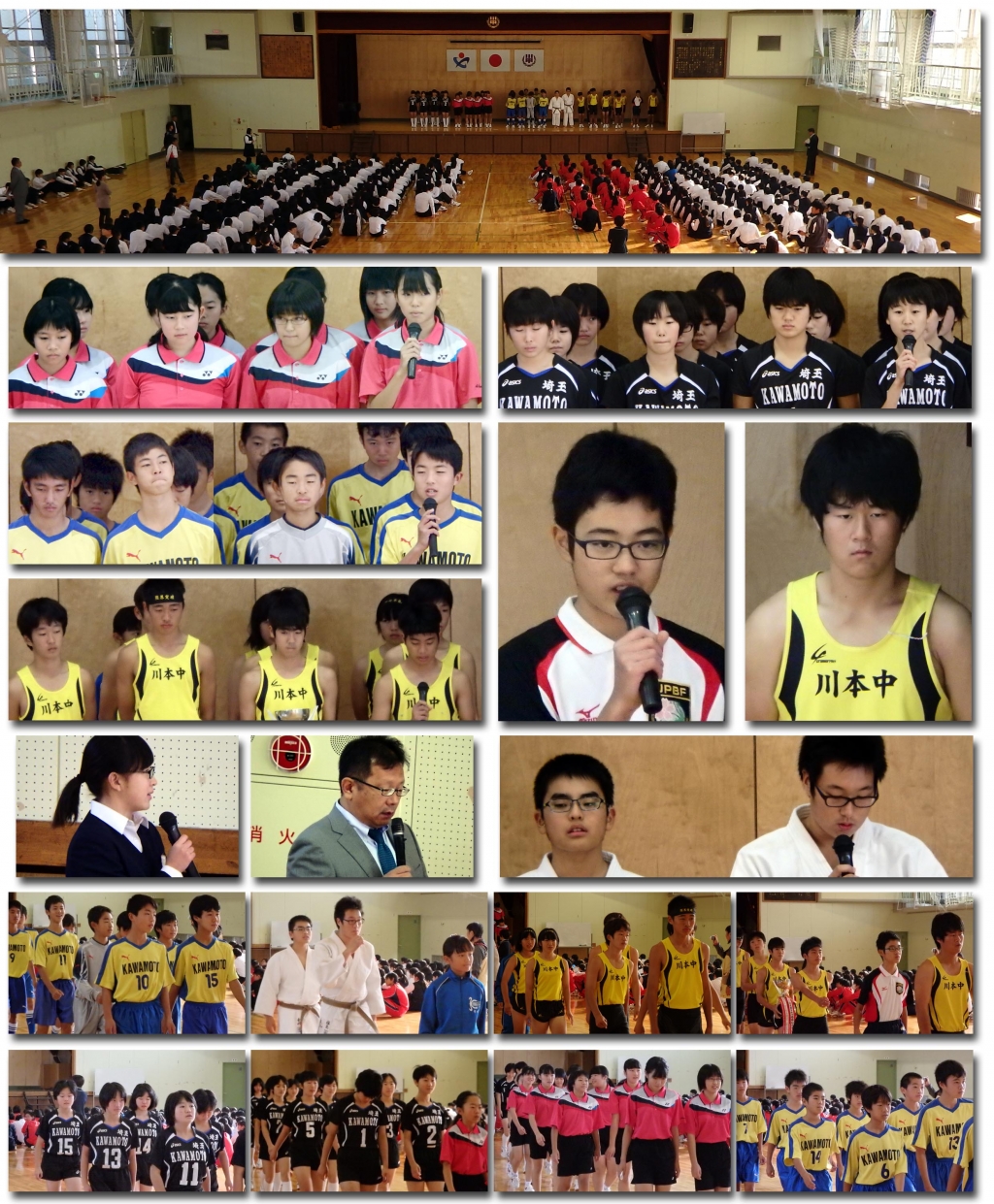 今朝は、ジュニアオリンピックに出場した馬場君、すでに県大会を終えた陸上部の皆さん(男子陸上競技部は団体優勝)、それに、ペタンクアジア大会に出場する地頭江君、先の地区大会で県大会出場を叶えた、柔道部、サッカー部、バドミントン部、バレー部の壮行会が体育館で行われました。市の代表として頑張って下さい。