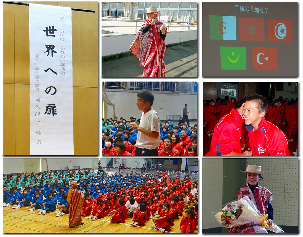 以前、チュニジアで活動されていたということで、イスラム圏の民族衣装を着ての講演。国旗についてや、文化の違いについてなど、幅広い内容をわかりやすく紹介してくださいました。また、スターウォーズの話にもなり、生徒達もとても興味を持って聴いていたようです。生徒の感想に「世界の扉の向こうを見させていただきました」とありました。とても刺激を受けた講演でした。