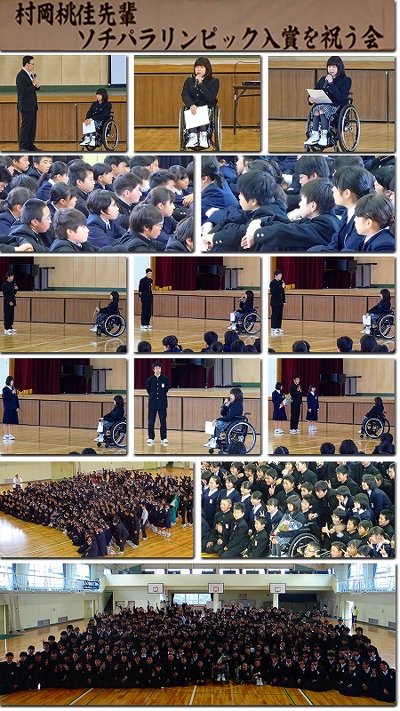 本日は本校の卒業生、村岡桃佳さんの「ソチパラリンピック入賞を祝う会」が行われ、川中のみなさんにご自分の経験による次のような貴重なお話をしていただきました。