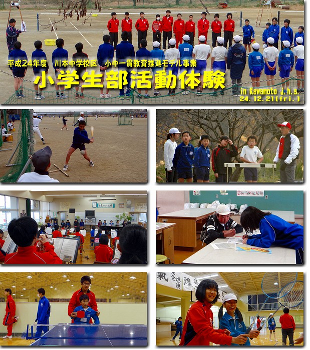 21日午後、交流推進部による、川本地区小中一貫事業『小学生部活動体験』が行われました。どの部も中学生が、北小、南小の児童に各部の楽しさを伝えていました。初めて手にするラケット、竹刀…。 間近で体感した吹奏楽の迫力…。初めての体験でみんな目が輝いていました。 小学生のみなさん、どうでしたか? 川中の先輩は、みなさんが入学して来るのを、楽しみに待っています。