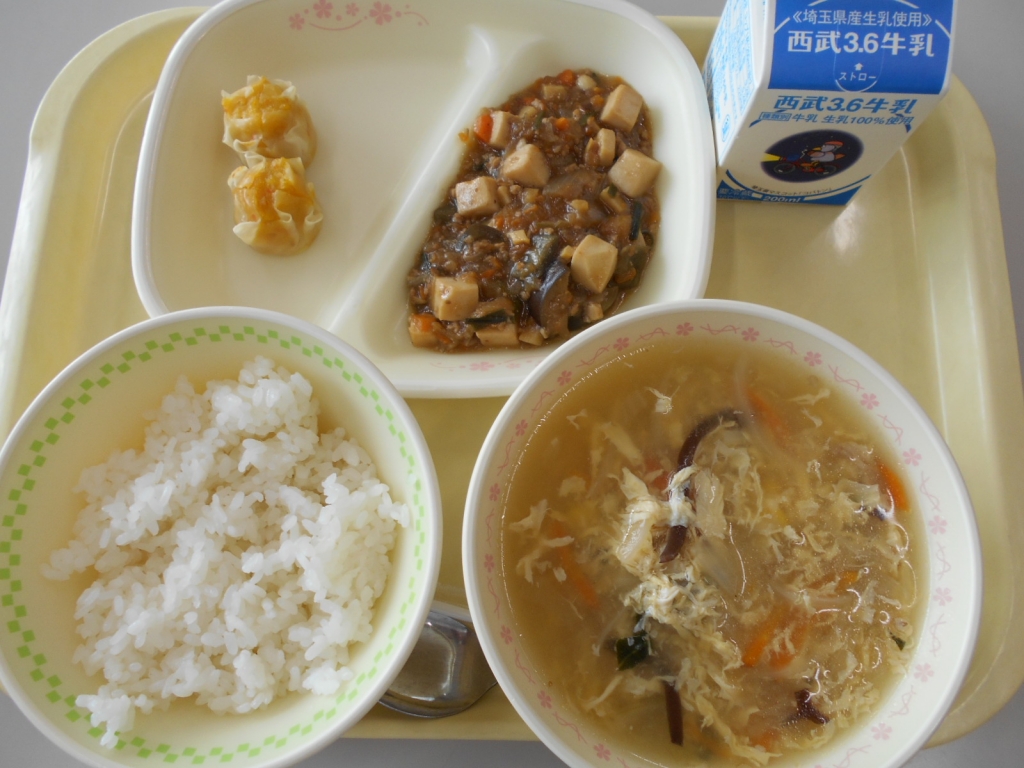 今日の給食は、ごはん、マーボー豆腐、揚げ餃子、中華スープでした。 揚げ餃子はカリカリで食べ応えがあり、とてもおいしかったです!!マーボー豆腐もご飯に合う味付けで、どんどんご飯が進みました!(^^)! ごちそうさまでした!!