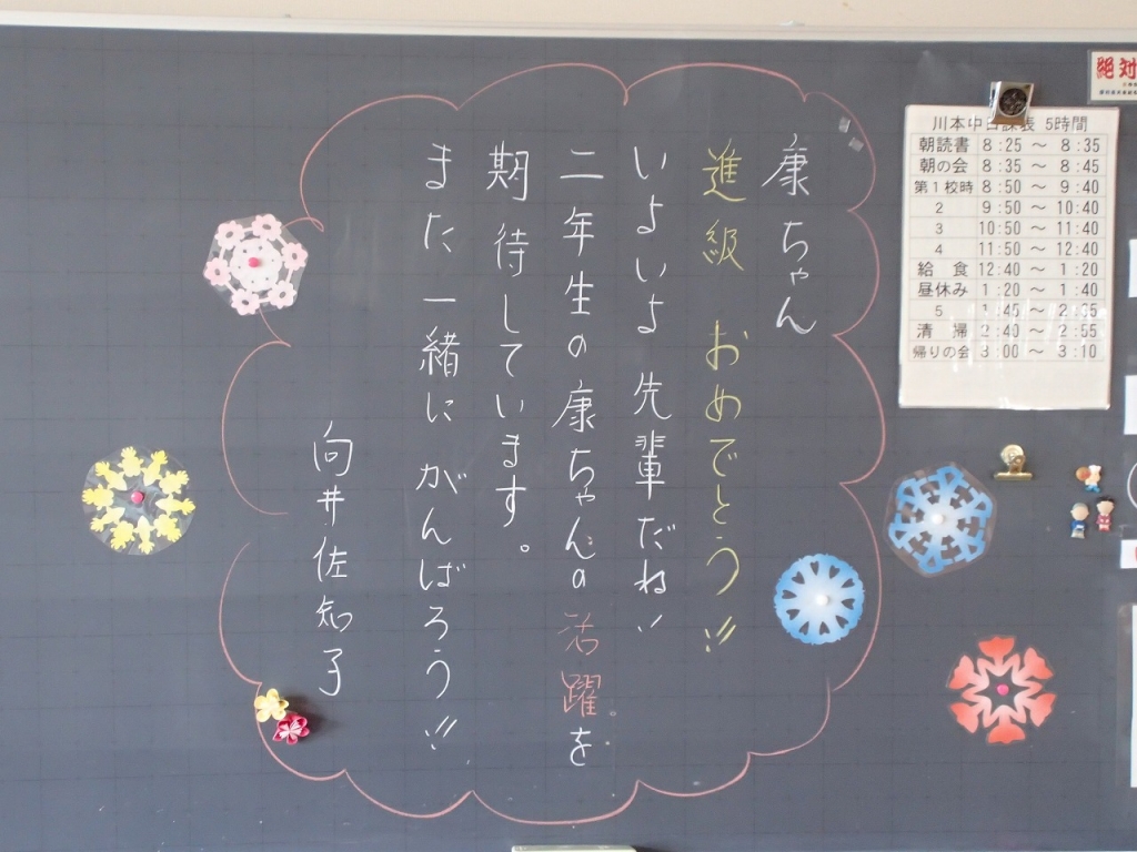 今日は、6年生の準備登校がありました。新年度に向けて、教室の机やイスを運び、また、1年生の教室の飾りつけや教科書の袋詰め、清掃を丁寧に行っていました。 春休みの間に、すっかり6年生の顔つきになっていました。