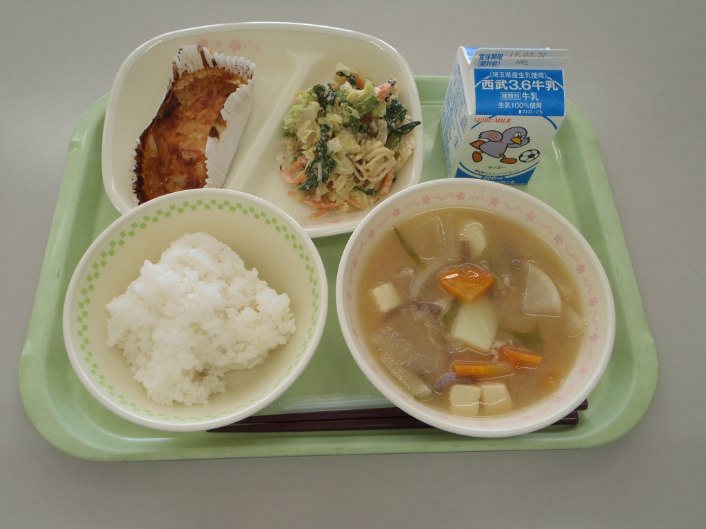 今日は、和食献立でした。鶏肉の味噌チーズ焼きは、味噌の味がしっかりとついていてチーズが香ばしくおいしかったです。生徒からも"今日のお肉おいしかった!”好評でした。