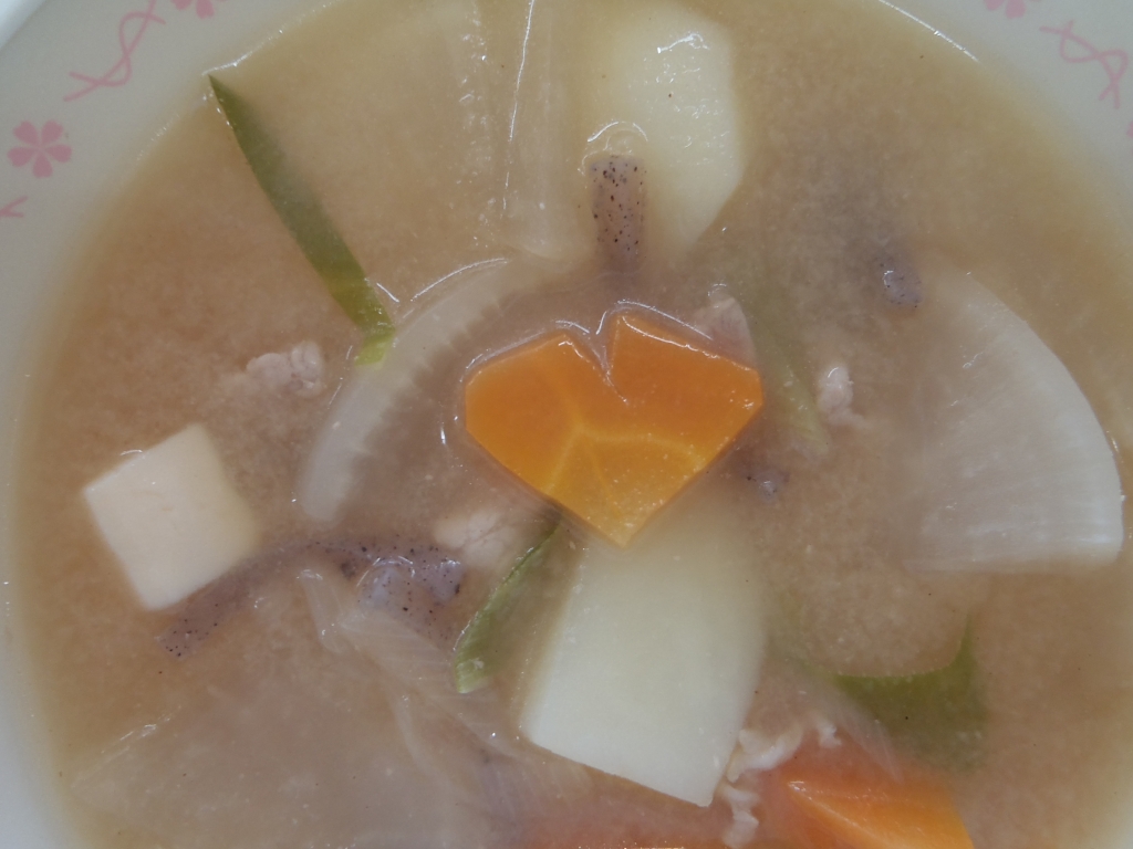 具だくさんで食べ応えたっぷりの豚汁には、ハートのにんじんも♡