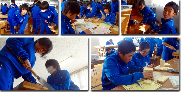 続いて、1年3組の技術科の授業です。 木工室で行い、ノコギリの実技授業でした。 みんな真剣に切っていました。 集中した表情がかっこいい! 1年3組でした。