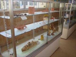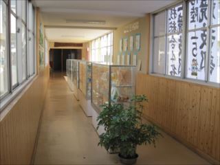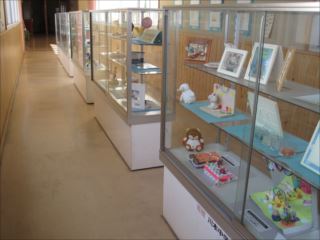 南北小学校から、作品をお借りして、2階通路のガラスケースに