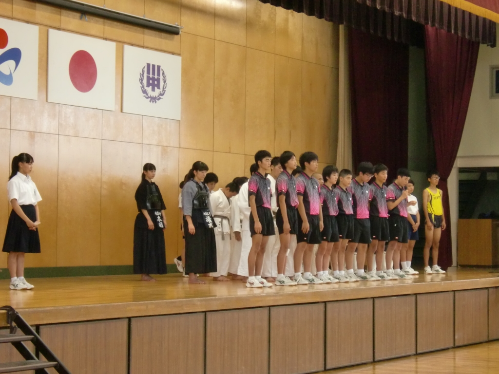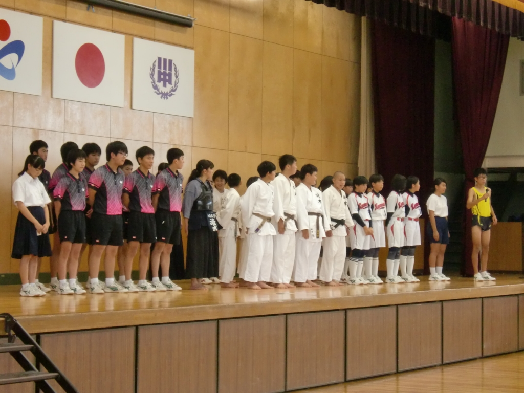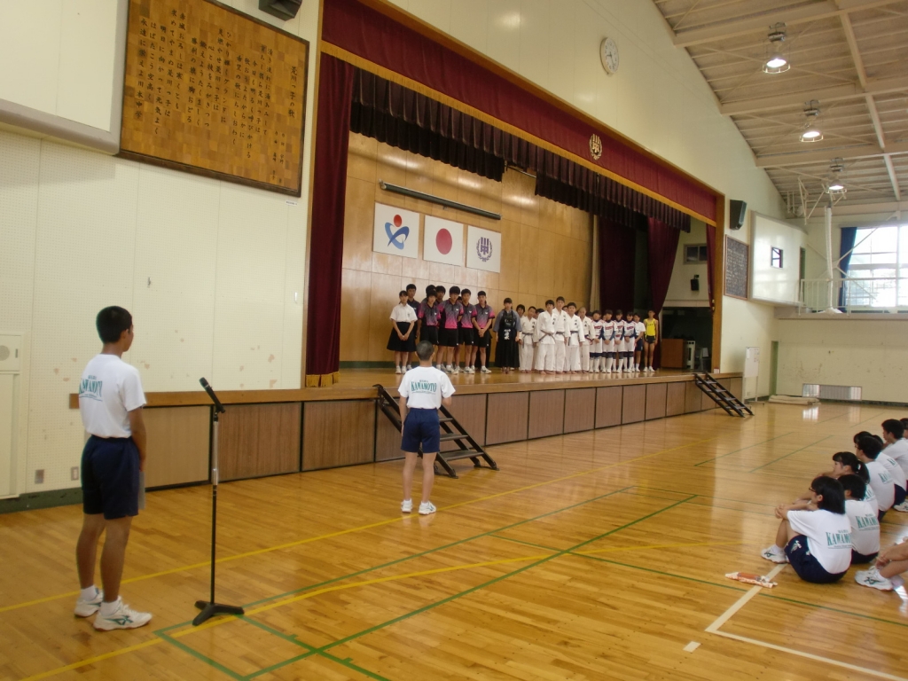 7月17日の朝,県大会へ出場する団体・個人を応援する「壮行会」が開かれました。この会は,生徒会と部長会が主催する会です。厳しい猛暑が続く中ですが,持てる力を十分に発揮してきてほしいと思います。選手のみなさんに,よい風が川本の地から吹くことを祈っています。