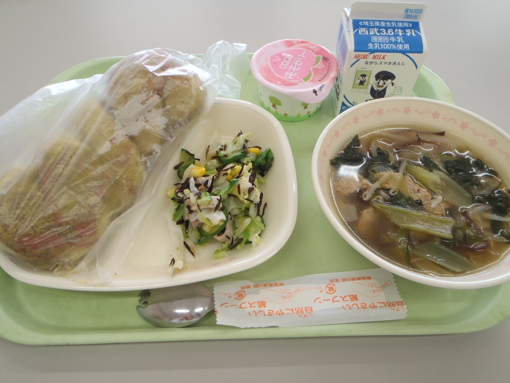 今日の給食は、もやしラーメン、手作り豆腐ドーナツ、チョレギ風サラダでした。 チョレギ風サラダは、ちりめんじゃこやのりが良いアクセントとなっていました。豆腐ドーナツも、中はサクサク、外はカリカリでとてもおいしかったです(^^)