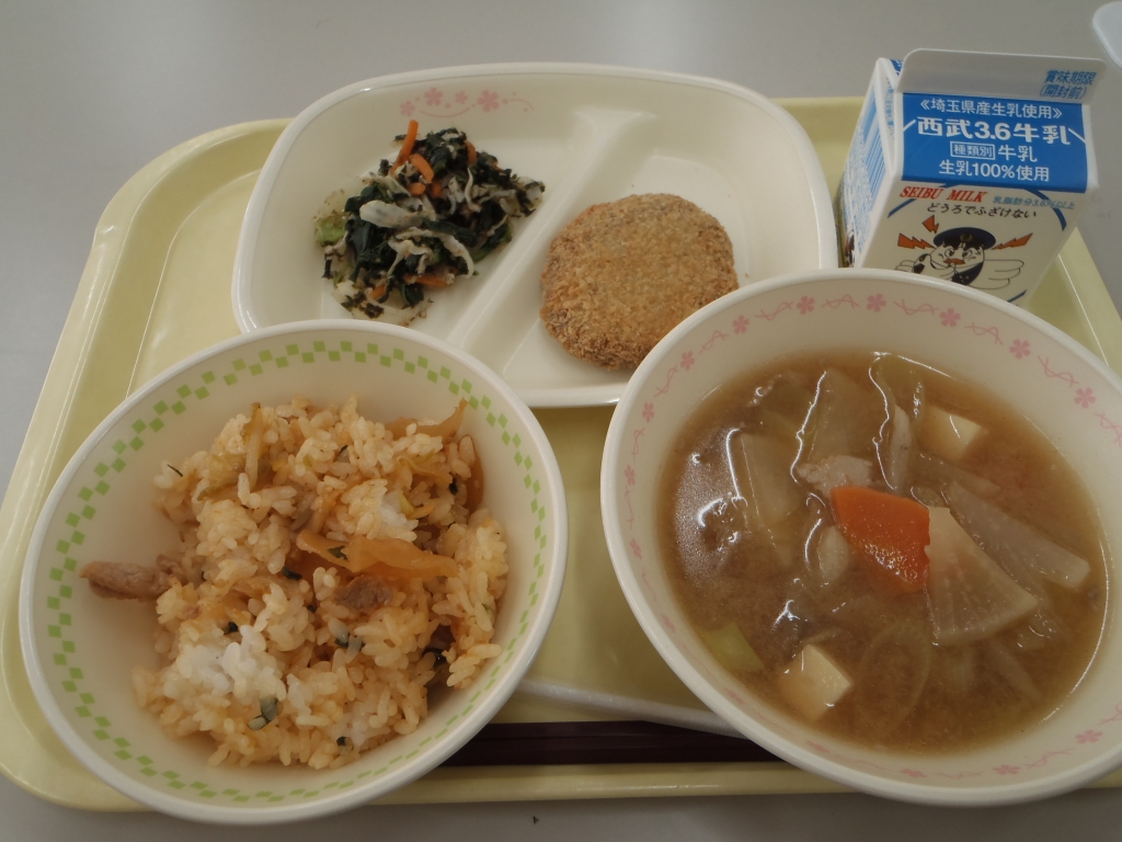 ⭐︎牛乳 ⭐︎ご飯 ⭐︎ホルモン揚げ ⭐︎上州サラダ ⭐︎こしね汁 今日は群馬県富岡市と深谷市の友好関係を記念した給食、「お富ちゃん給食」です。 富岡市には、世界遺産の富岡製糸場があります。渋沢栄一翁も富岡製糸場の設立に貢献しました。ホルモン揚げは...
