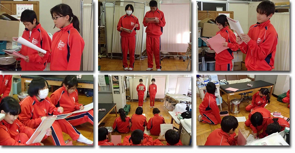 スキー教室の保健関係は、保健委員会のみなさんが頑張って取り組んでいます。今日は、事前健康観察の内容を、みなさんに連絡する時の練習や、グラフの読み取り方の練習などを行いました。他のクラスの発表を聞き、良いところ、改善したほうがいいところも言い合いました。また、終業式の発表の練習も行いました。