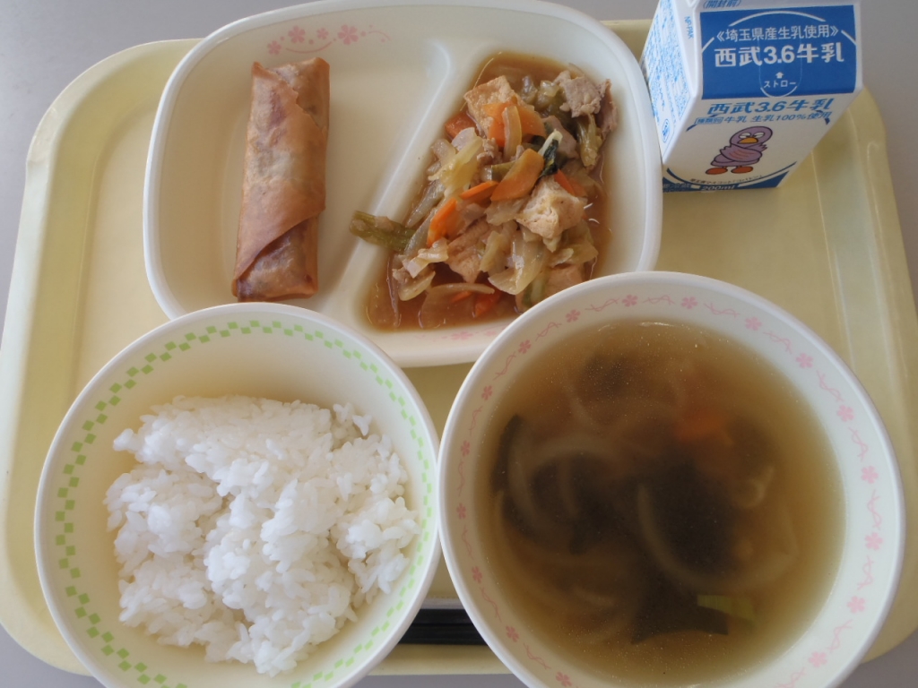 今日の給食は、マーボーラーメン、深谷レンガパンケーキ、春雨サラダでした。 マーボーラーメンは少し辛めのとろとろしたスープで、麺との相性も良く、とてもおいしかったです!(^^)!