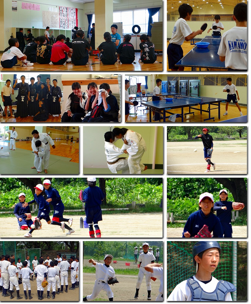 体育館をのぞくと、バド部が顧問を囲んでのミーティングの様子、その隣では、剣道部が練習を中断し休憩中の様子でした。体育館の2Fでは卓球部が一日練習をやるとのこと。柔道部は外部コーチの方の指導の下で練習をしていました。
