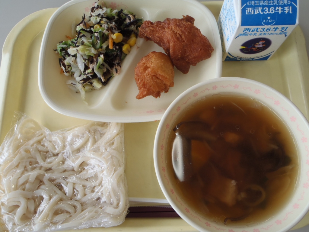 今日の給食は、マーボーラーメン、深谷レンガパンケーキ、春雨サラダでした。 マーボーラーメンは少し辛めのとろとろしたスープで、麺との相性も良く、とてもおいしかったです!(^^)!