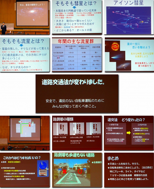 本日8時15分より全校朝会が行われました。前半は校長先生による流星や彗星の事についての話がありました。後半は改定された道路交通法についてでした。右側通行禁止など自転車運転をするときの諸注意があり、今後、どのように自転車を運転していけばよいか、スクリーンを使ってわかりやすく説明されました。毎日必要な自転車なので乗るときは、今日の説明を思い出してルールを守りましょう。