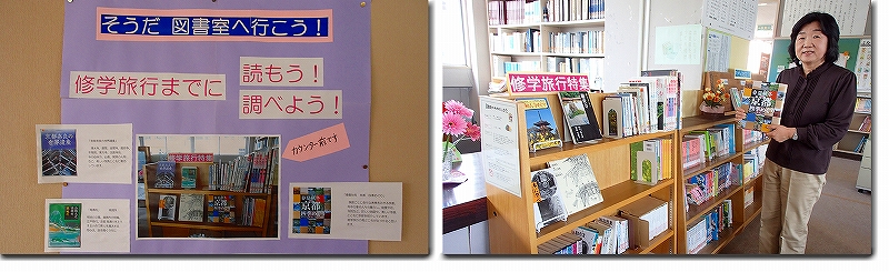 写真左は、2階廊下に掲示されているものです。図書館補助員の内田先生が掲示してくださったものです。3年生の修学旅行に向けて、多くの本を準備してくださっています。