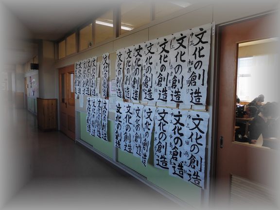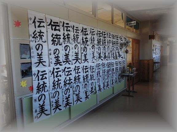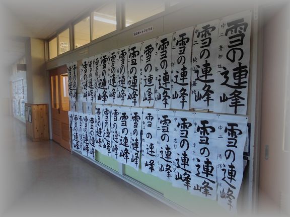 教室前の廊下に、冬休み中の宿題だった書きぞめが展示されています。年の初めにとてもふさわしい風景です。