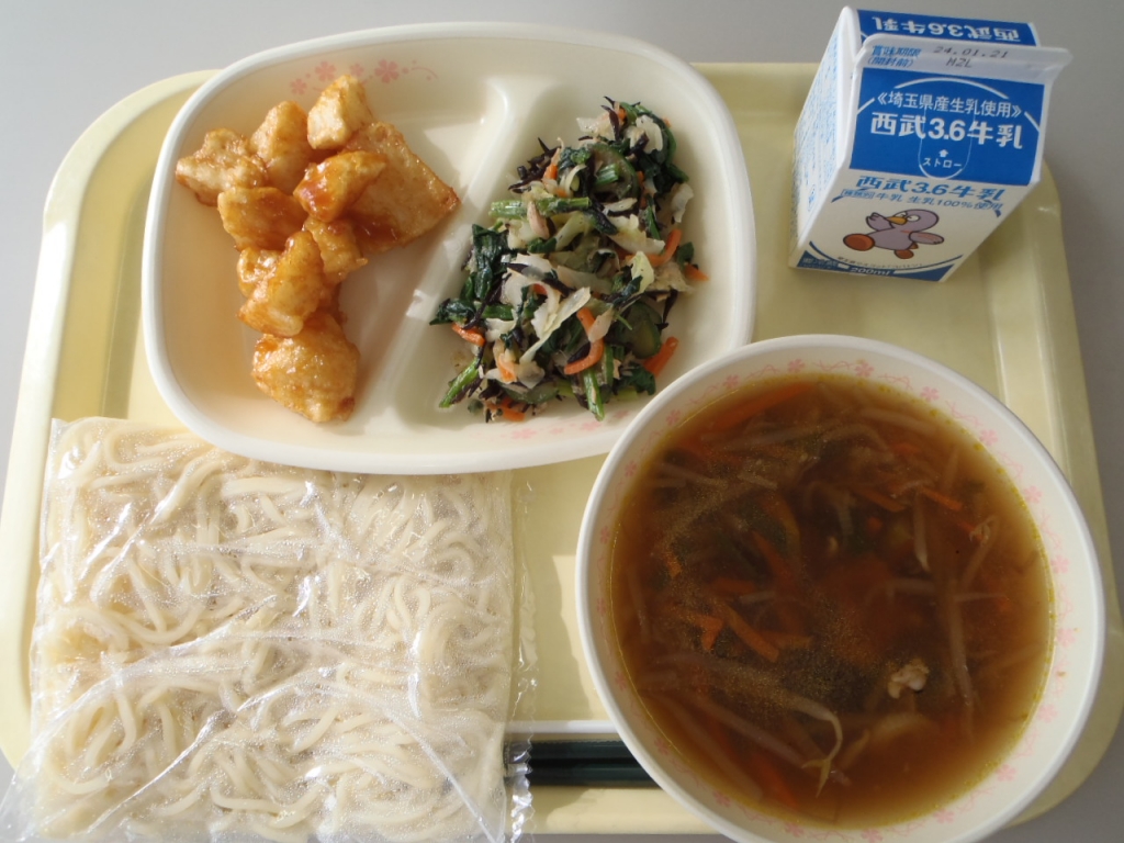 今日の給食は、マーボーラーメン、深谷レンガパンケーキ、春雨サラダでした。 マーボーラーメンは少し辛めのとろとろしたスープで、麺との相性も良く、とてもおいしかったです!(^^)!